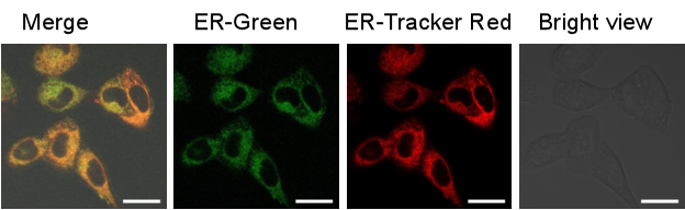 ER-Green是生光生物科技公司通過對對文獻(xiàn)報道內(nèi)質(zhì)網(wǎng)探針進(jìn)行結(jié)構(gòu)修飾與優(yōu)化,篩選得到的一類高選擇性內(nèi)質(zhì)網(wǎng)定位綠色熒光探針。ER-Green可以用于活細(xì)胞內(nèi)質(zhì)網(wǎng)特異性熒光染色。與商業(yè)化 ER-Tracker Red 等探針相比,ER-Green熒光強度強,細(xì)胞毒性低,光穩(wěn)定性強。ER-Green在活細(xì)胞內(nèi)持續(xù)時間長,可以和其它探針實現(xiàn)聯(lián)合使用。